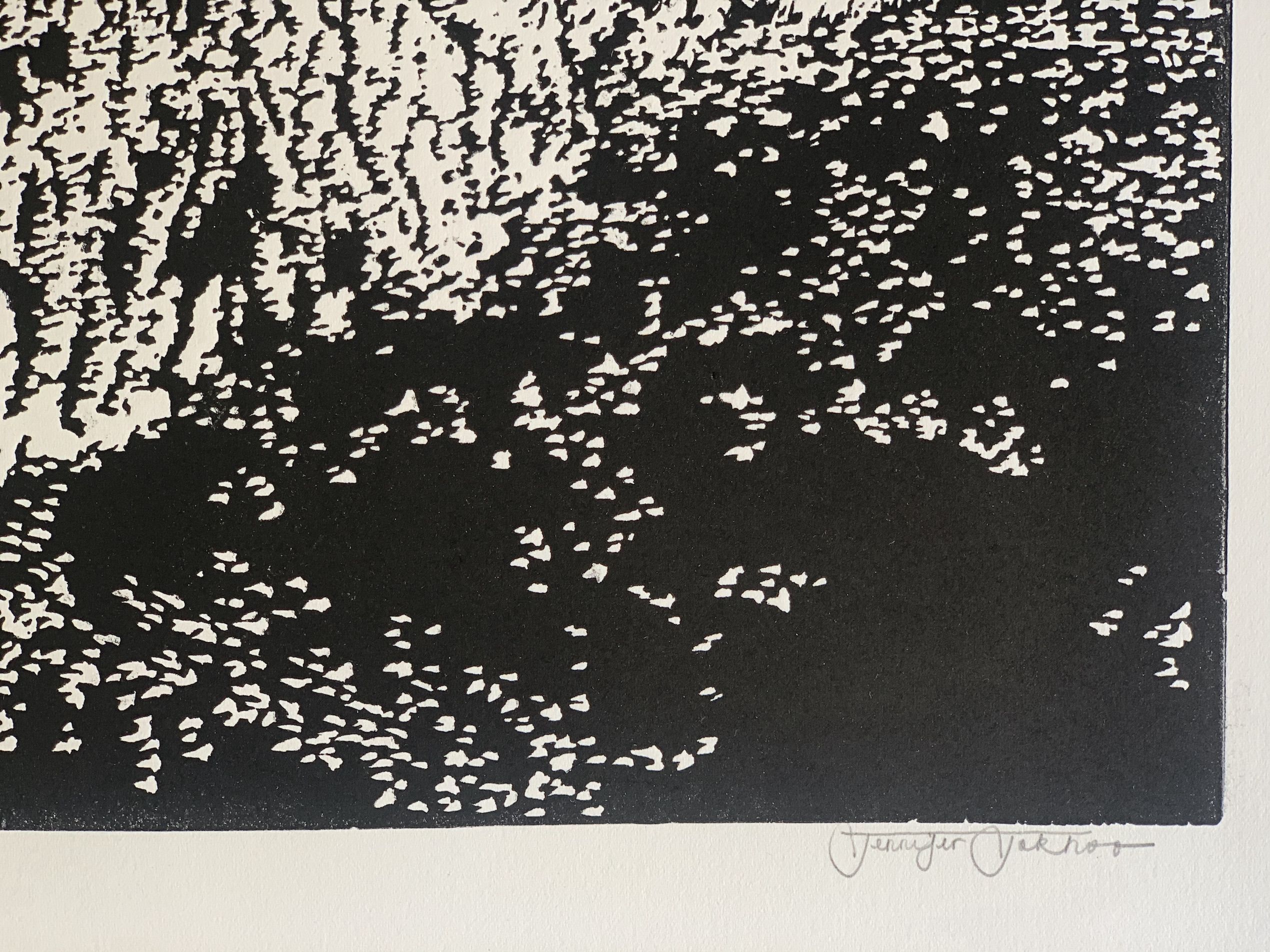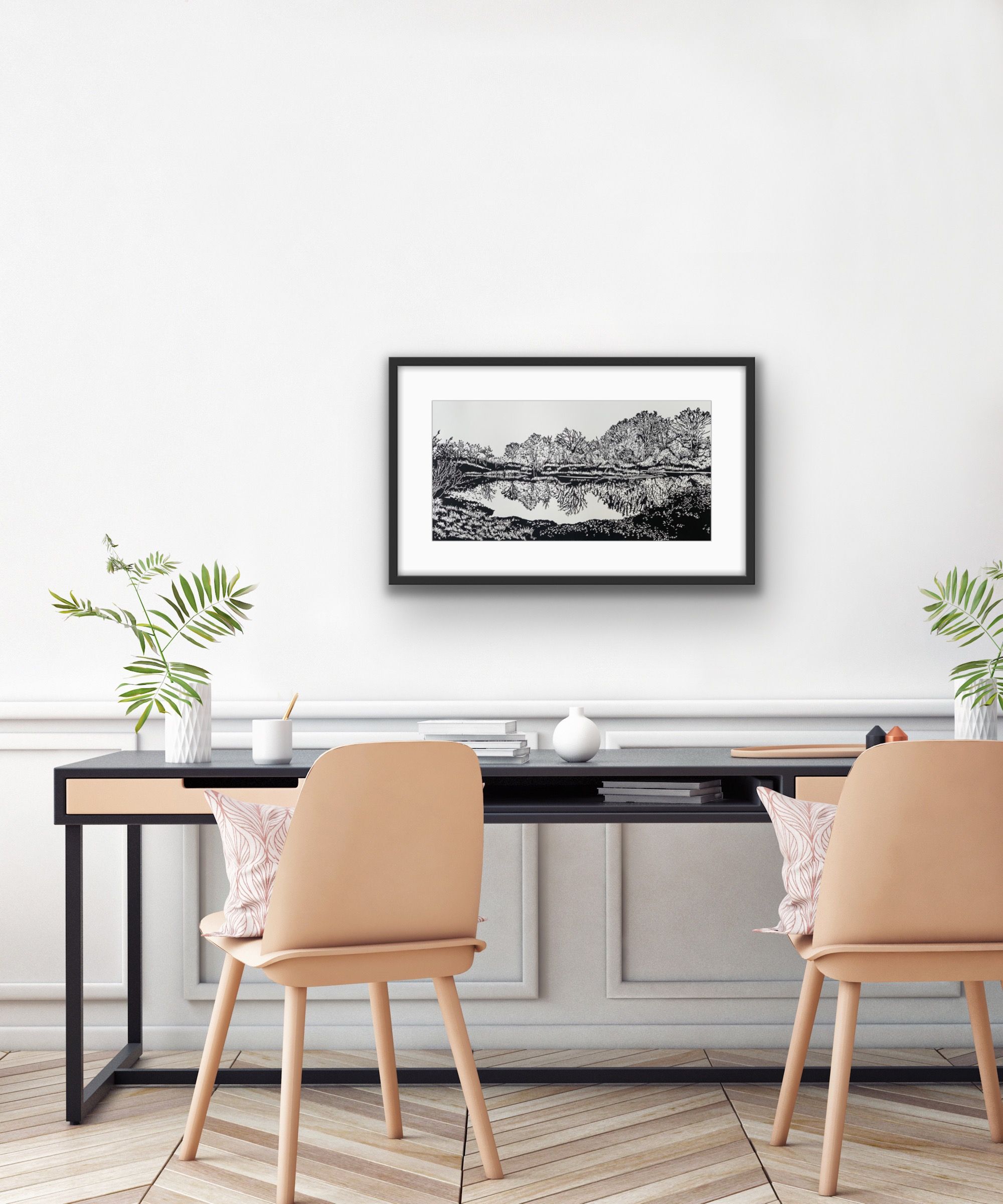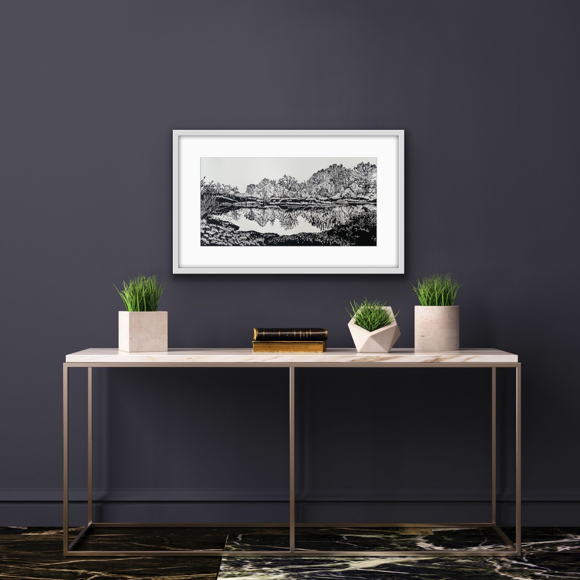 This is a black and white linocut version of the 10 colour reduction linocut ‘Autumn blaze’ The image depicts a pond in the Surrey hills during the height of Autumn. The print was pulled just prior to the final layer of cutting and inking. This image reflects a moment in