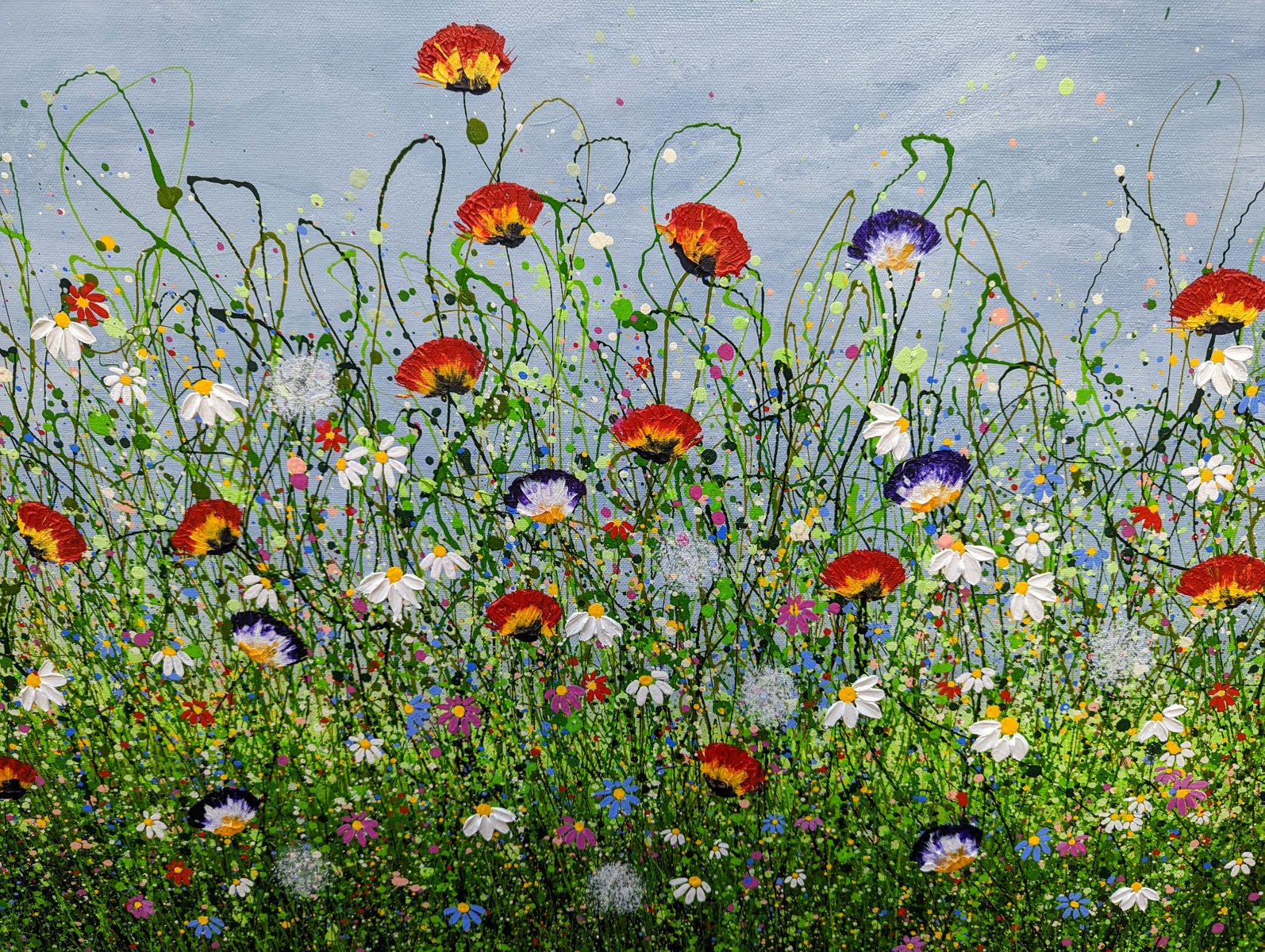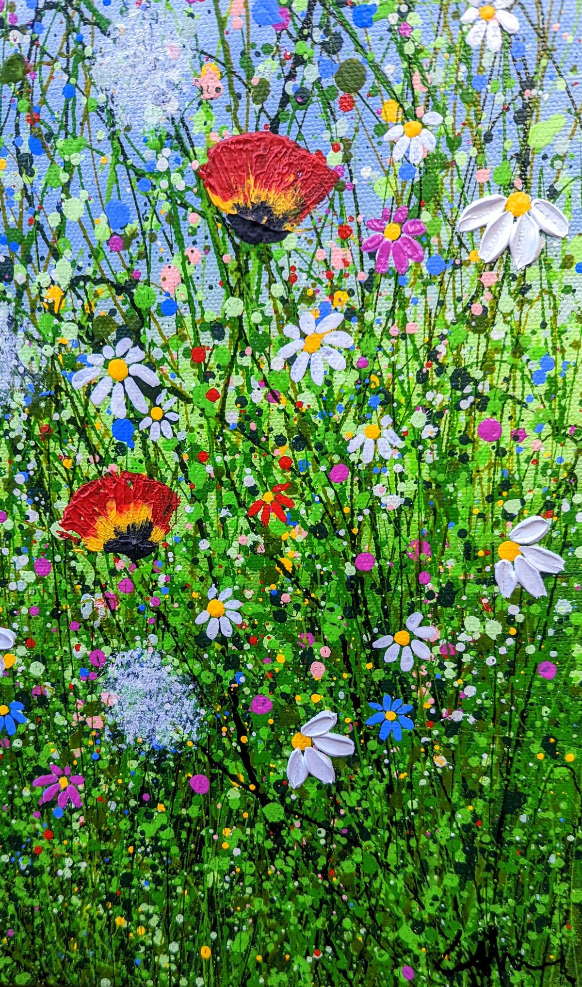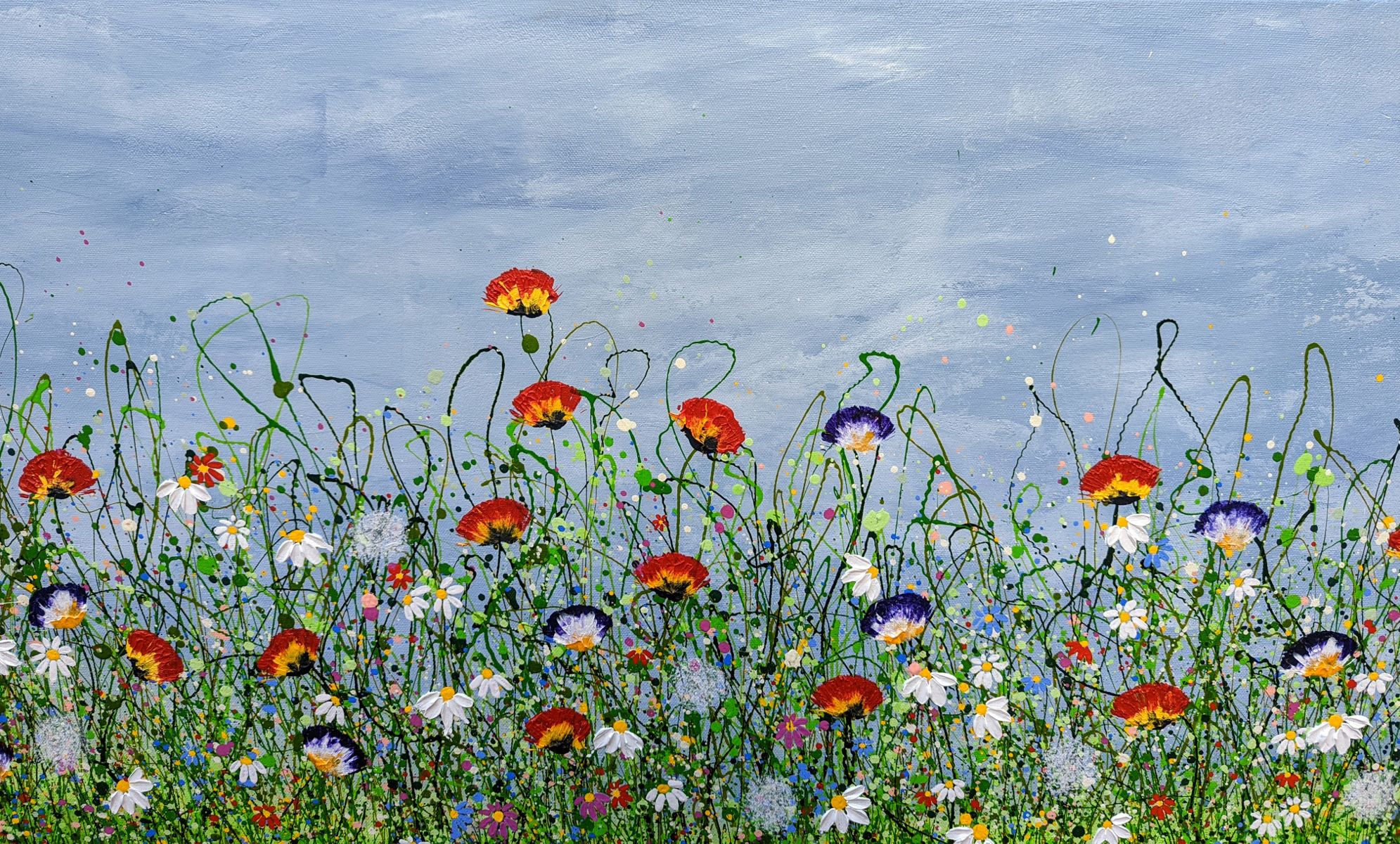 Where Wild Meadows Whisper #3 60 x 97 cm Using a heavy texture I have created this happy floral meadow popping with daisies, tulips and pansies. I love painting abstract landscapes, using my techniques to put movement into the painting bringing it to life Wychwood Art comments " We love