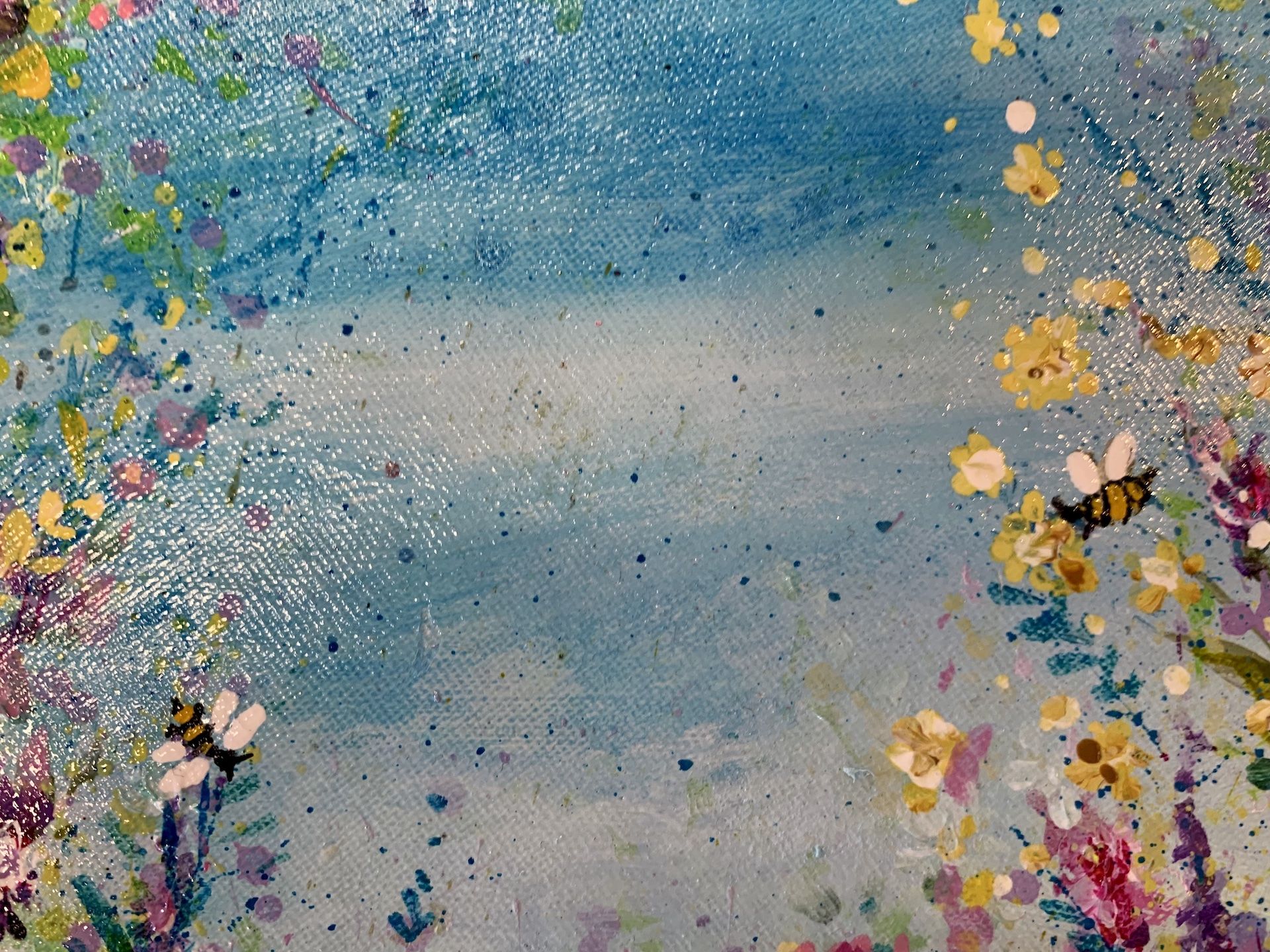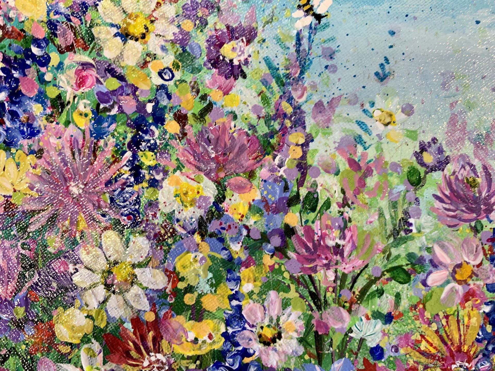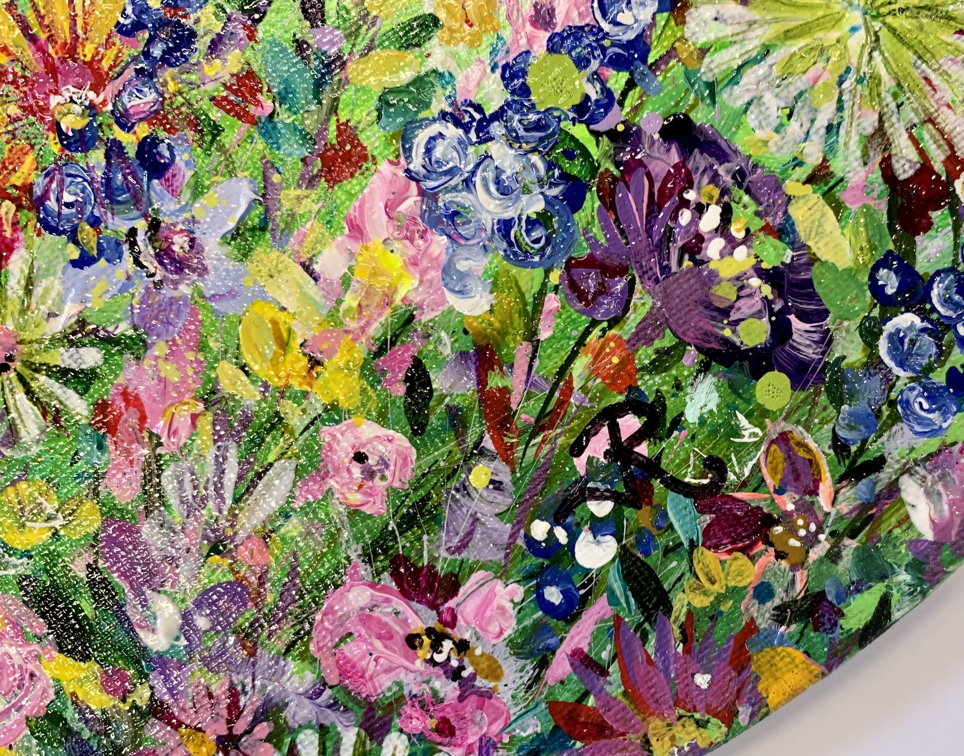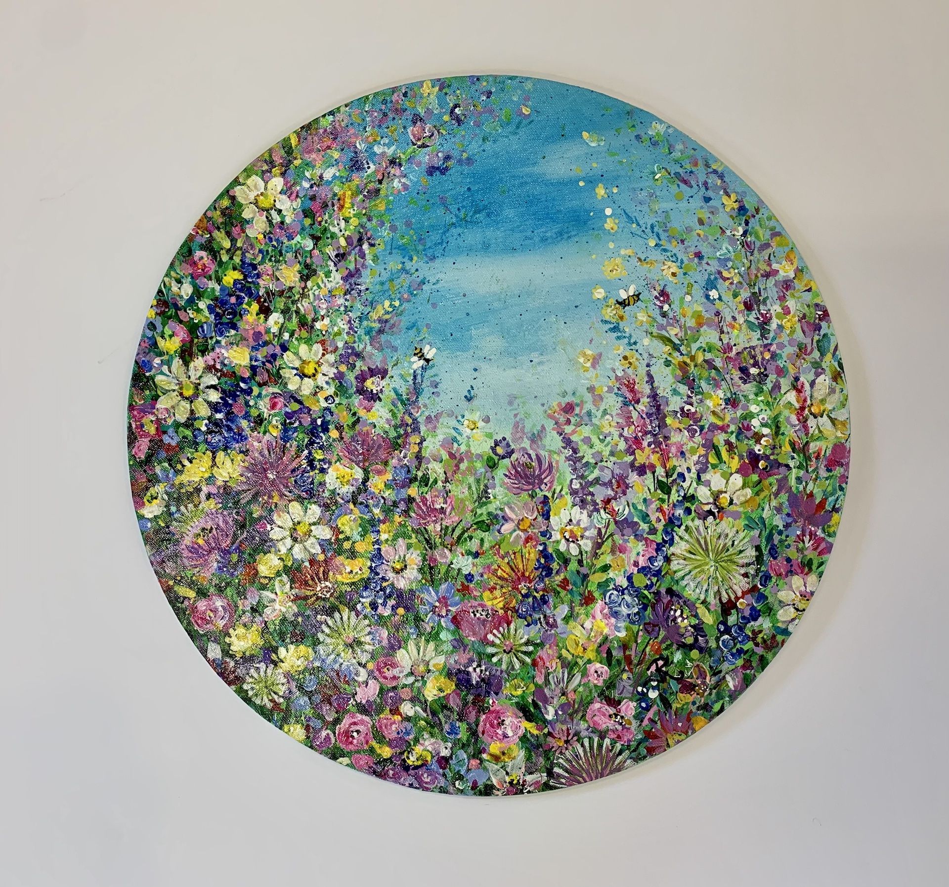 Wild Flower Garden With Bees by Jan Rogers is a circular original acrylic painting of a floral garden with bees against a blue sky.