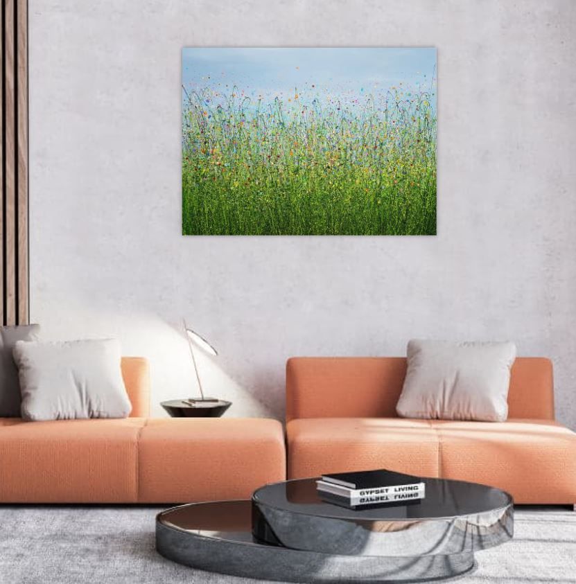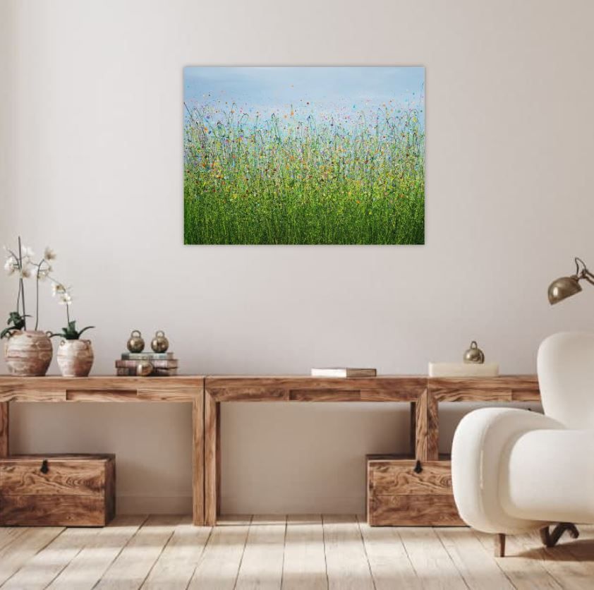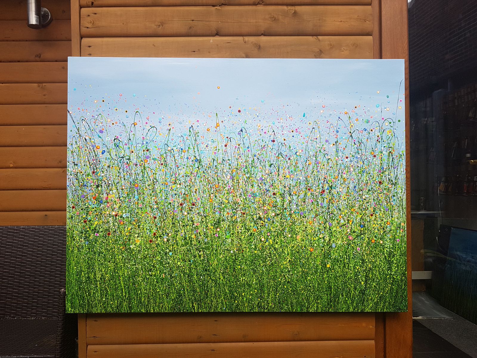 Wild Meadow Symphony - An Original semi-abstract painting by Lucy Moore. Using her signature string grass technique Lucy has created a semi-abstract twist to her classic meadow paintings. This piece would brighten any home or office, bring a little of the outside inside. We love Lucy Moore's original meadow paintings.