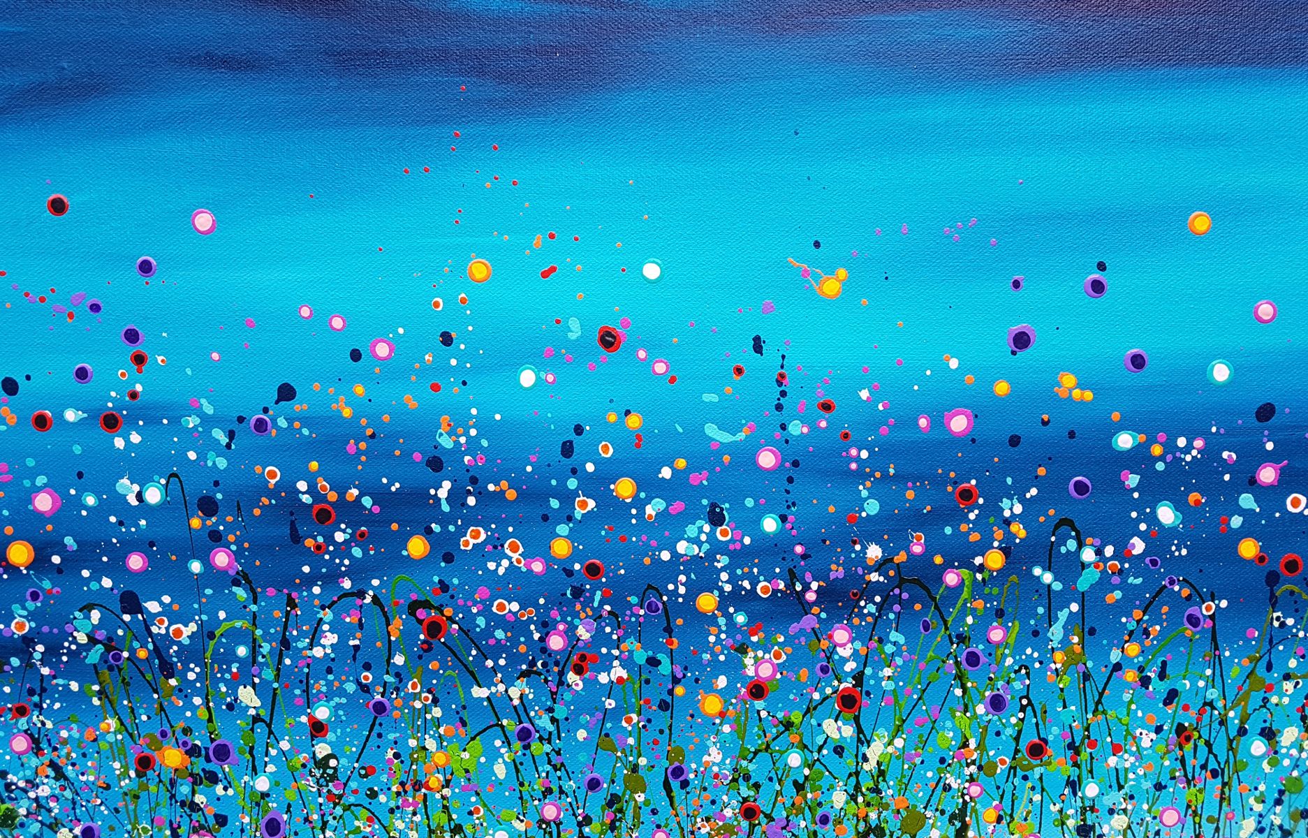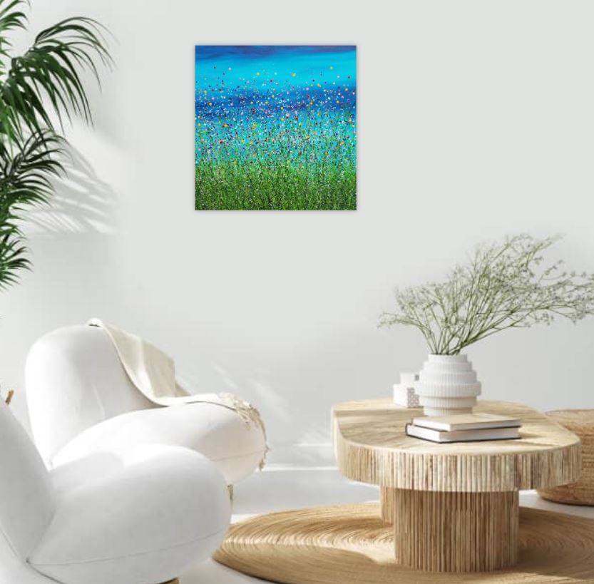 Wild Turquoise Meadows #6 - An Original semi-abstract painting by Lucy Moore. With my meadow piece I like to play around with coloured skyscapes, Turquoise is one of my favourite colours it makes other colours like pike and orange really pop. " Wychwood Art comments " We love Lucy Moore's
