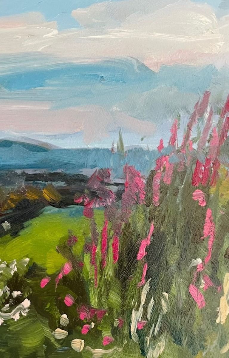 Original Willow herb and loch, Pentland hillsn by Natalie Bird, oil on board painting, in a impressionist style. The landscape composes of green hills with floral acents of pink and white flowers, on pink and blue sky. Additional Information: Original Oil on board Image size: H:20 cm x W:30 cm Complete Size of Unframed Work: