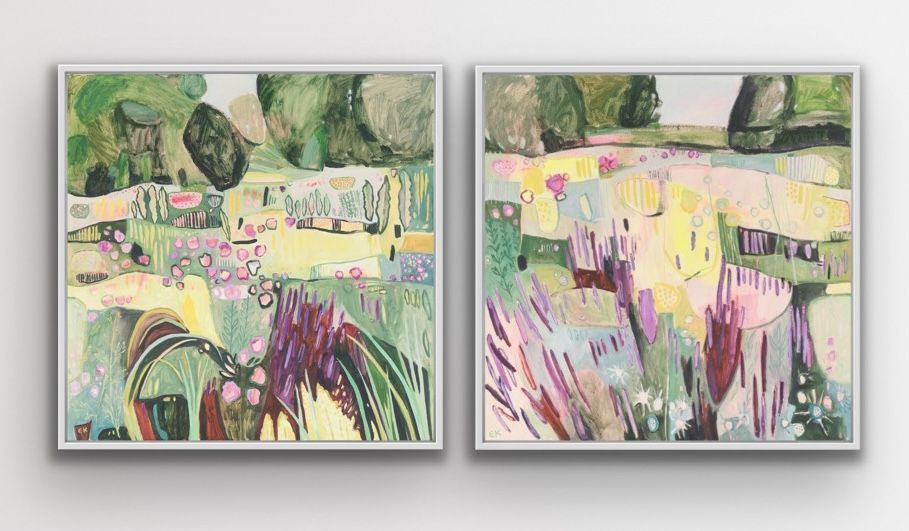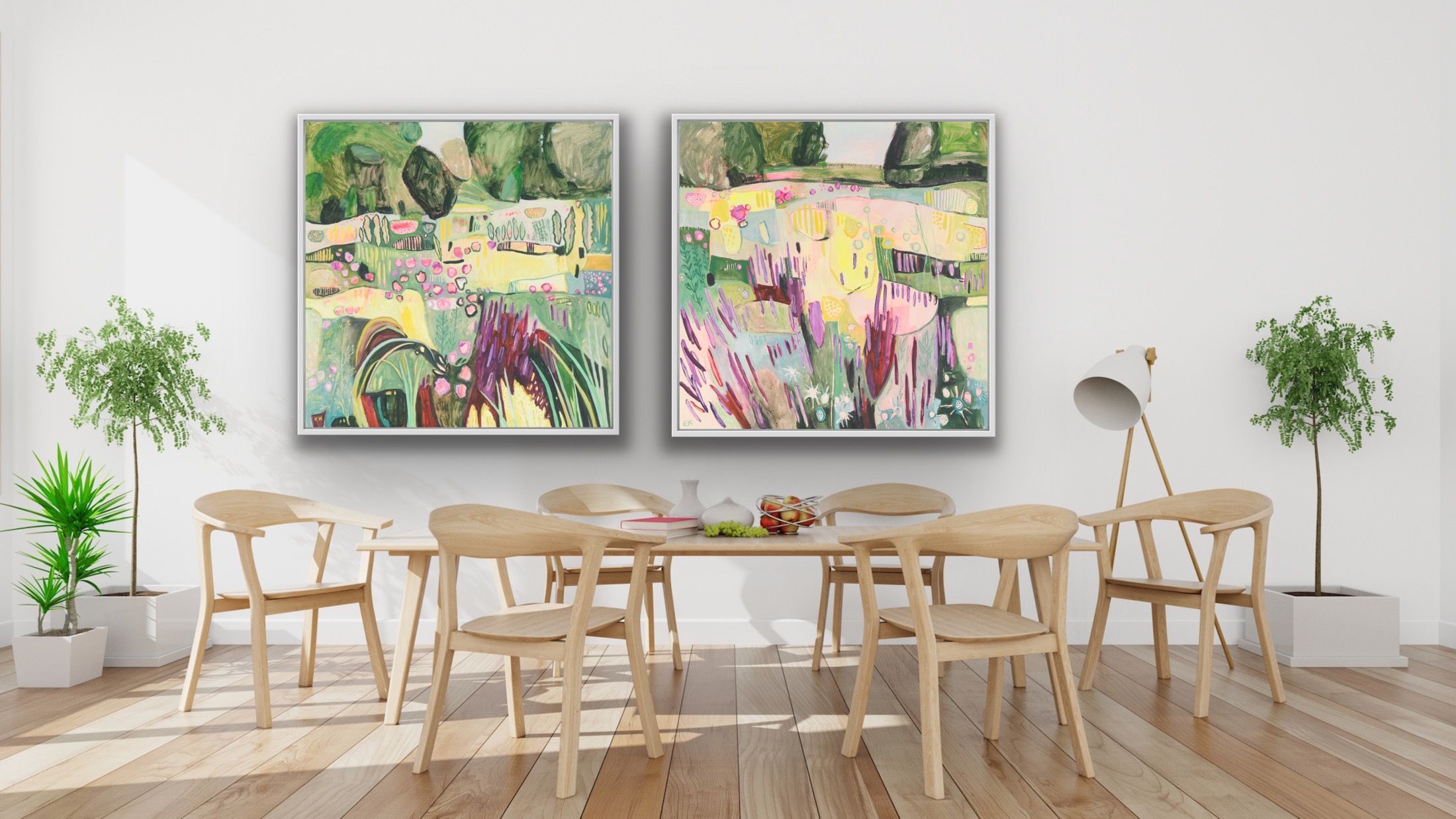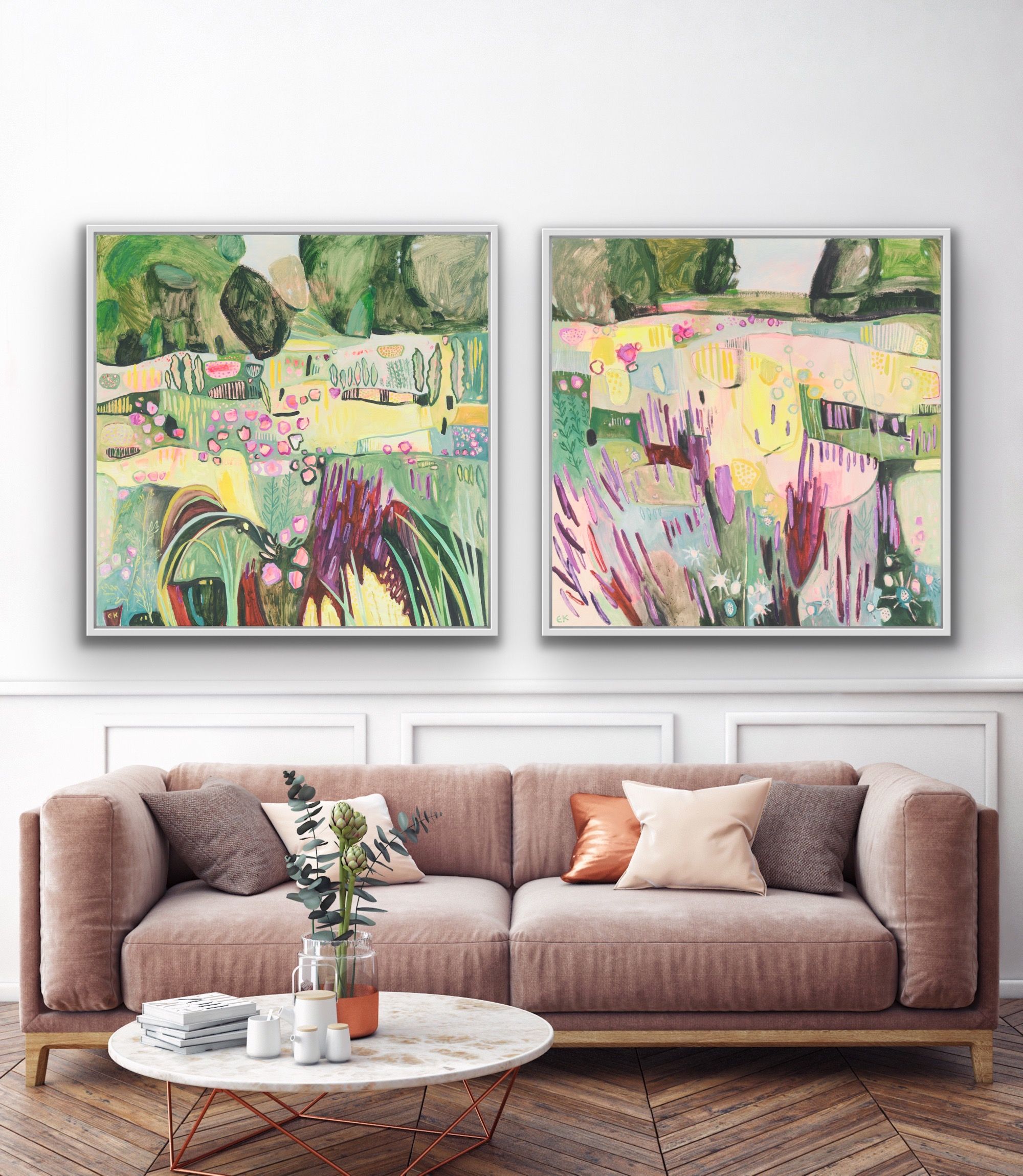 Yellow, Purple and Pink in the Merton Borders Diptych is an original painting by Elaine Kazimierczuk . The work is made of 2 canvases each 100cm x 100cm unframed and 102cm x 102cm framed, the dimensions above are for the total work. The dazzling array of colours in the Merton Borders