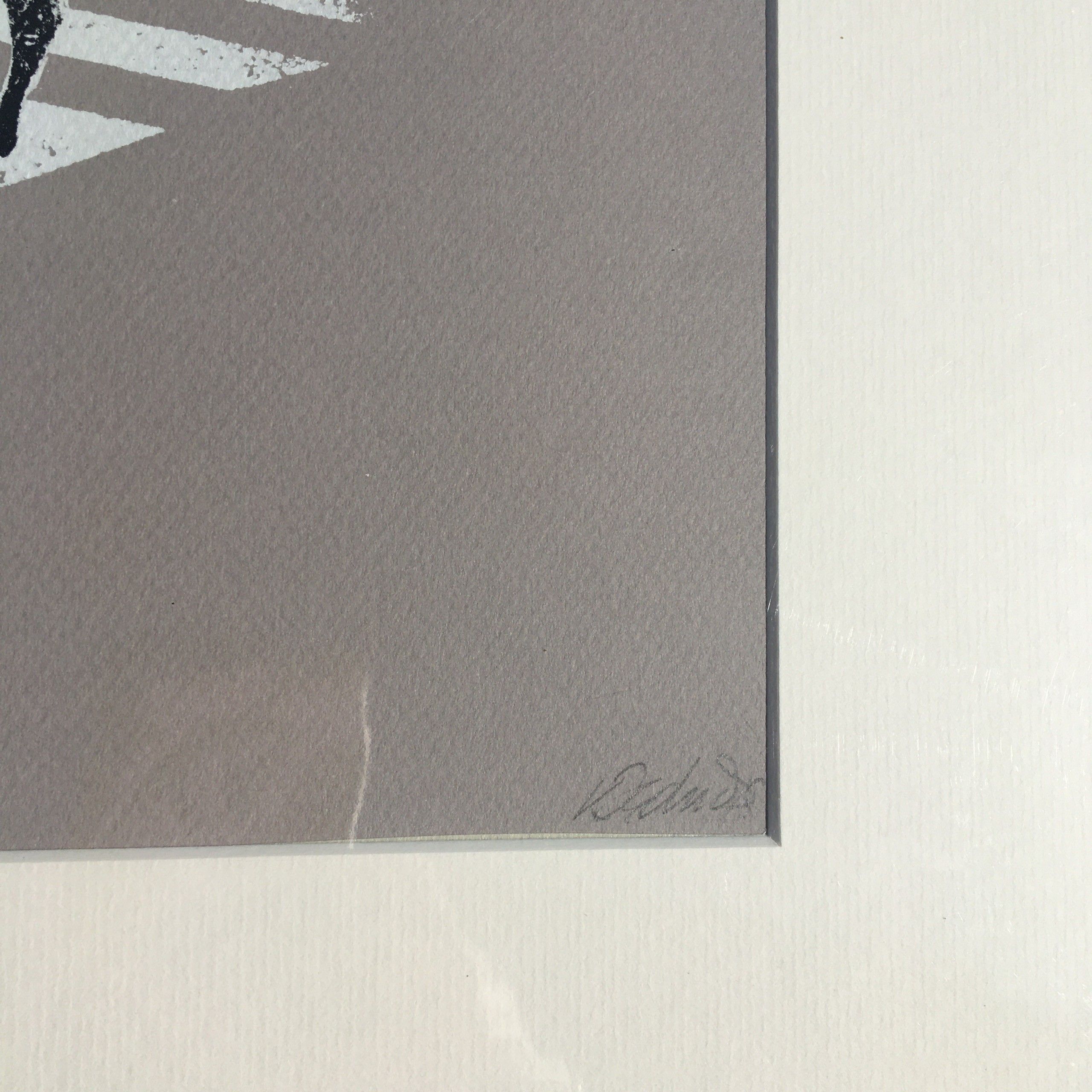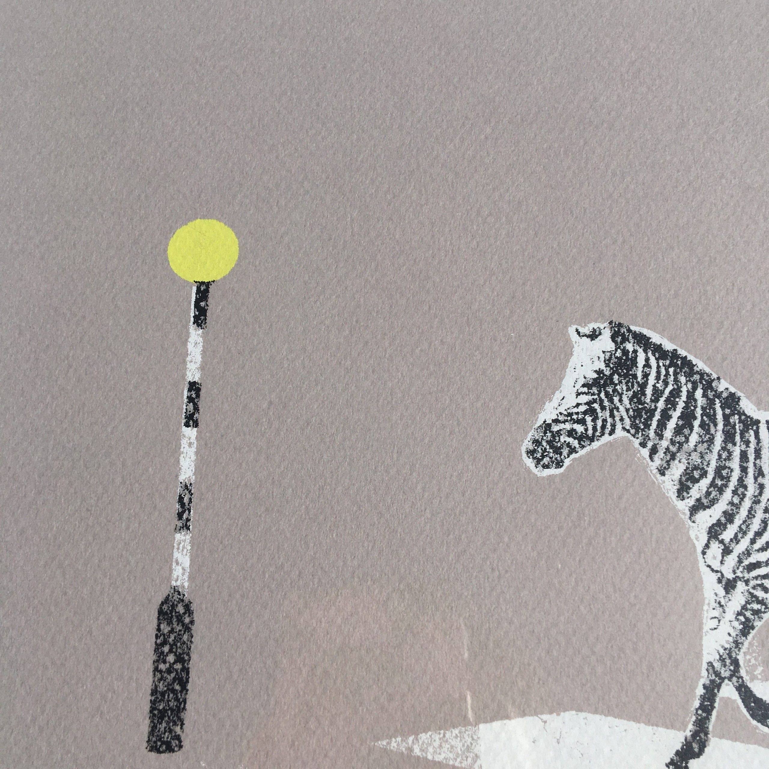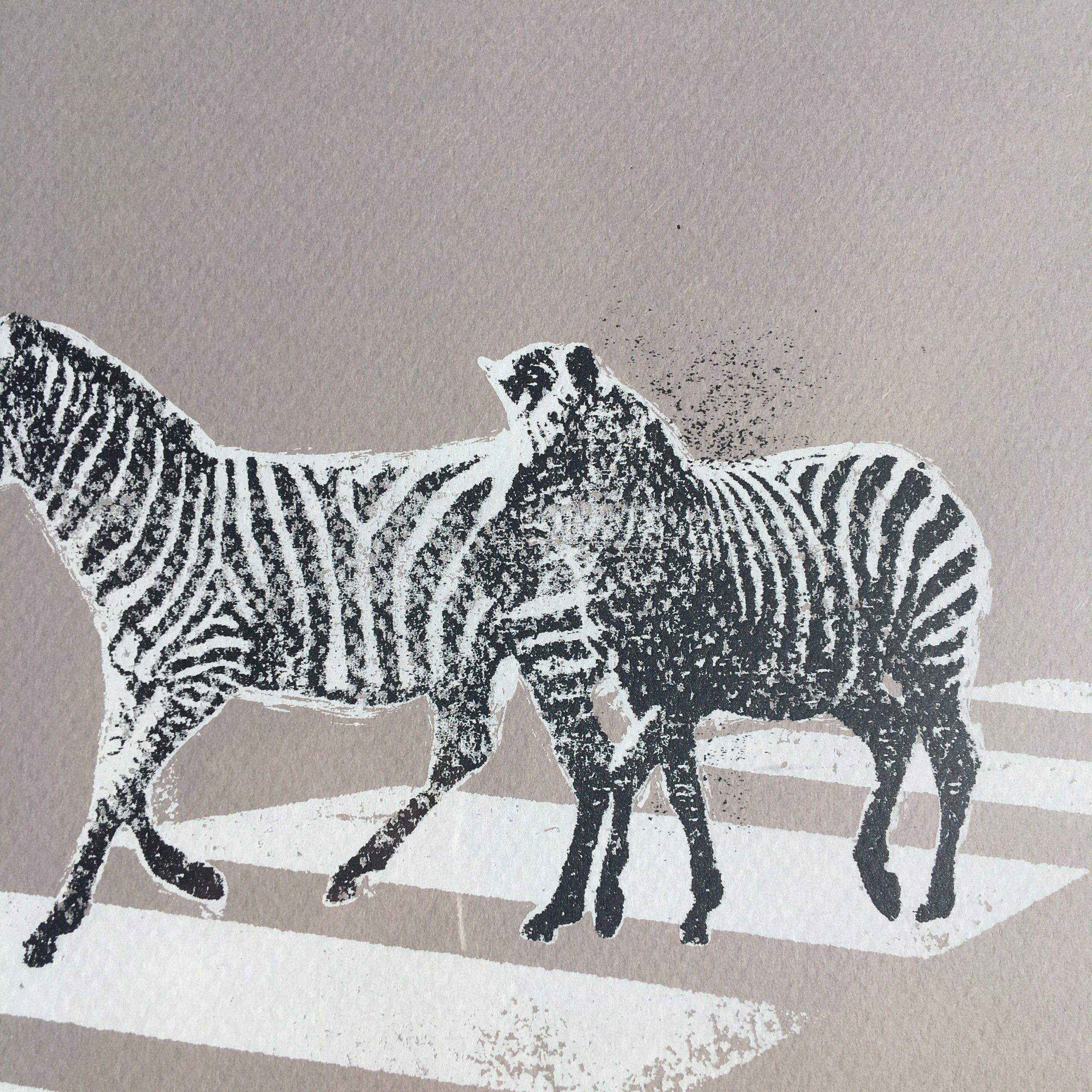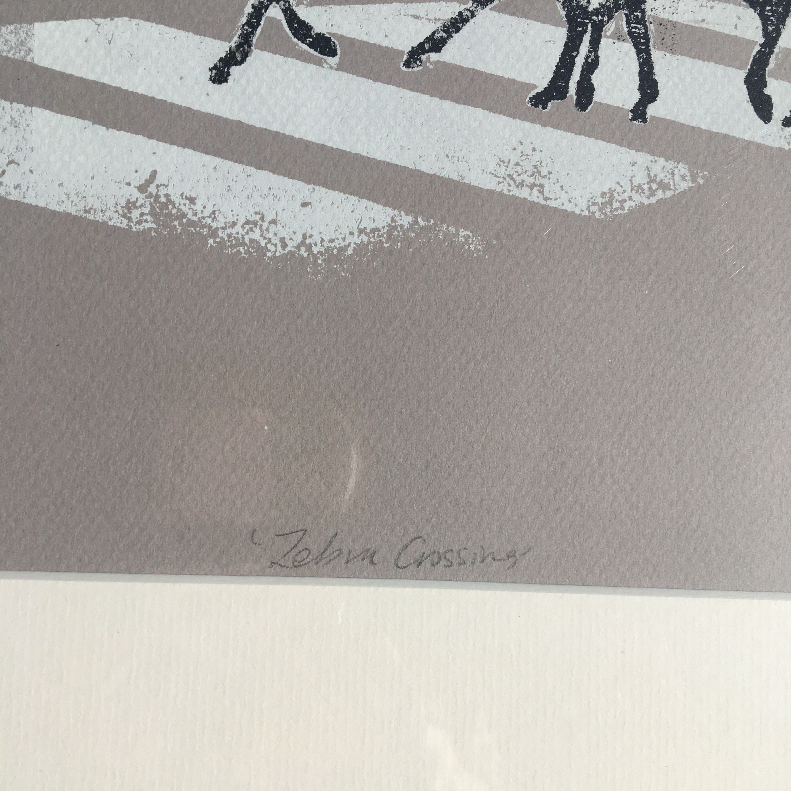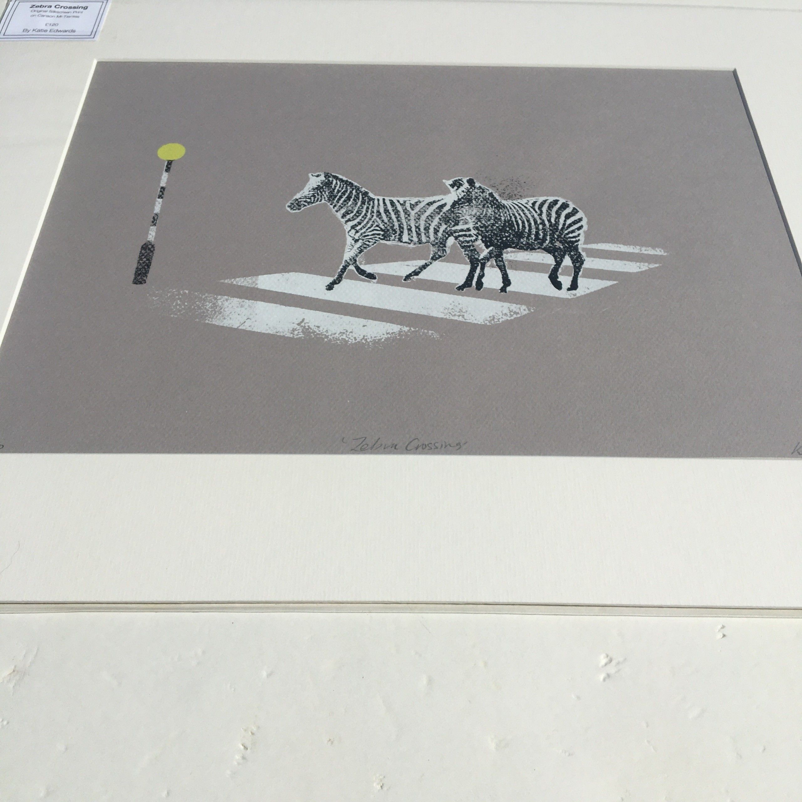 Katie Edwards. Zebra Crossing- this piece was first created in 2007, due to its popularity it has been recreated in 2015 as a Limited Edition Print. The play on words creates a striking and humorous image. Limited Edition of 100, 3 colour screen print on Canson Mi-Tientes 160gsm textured paper. This work is