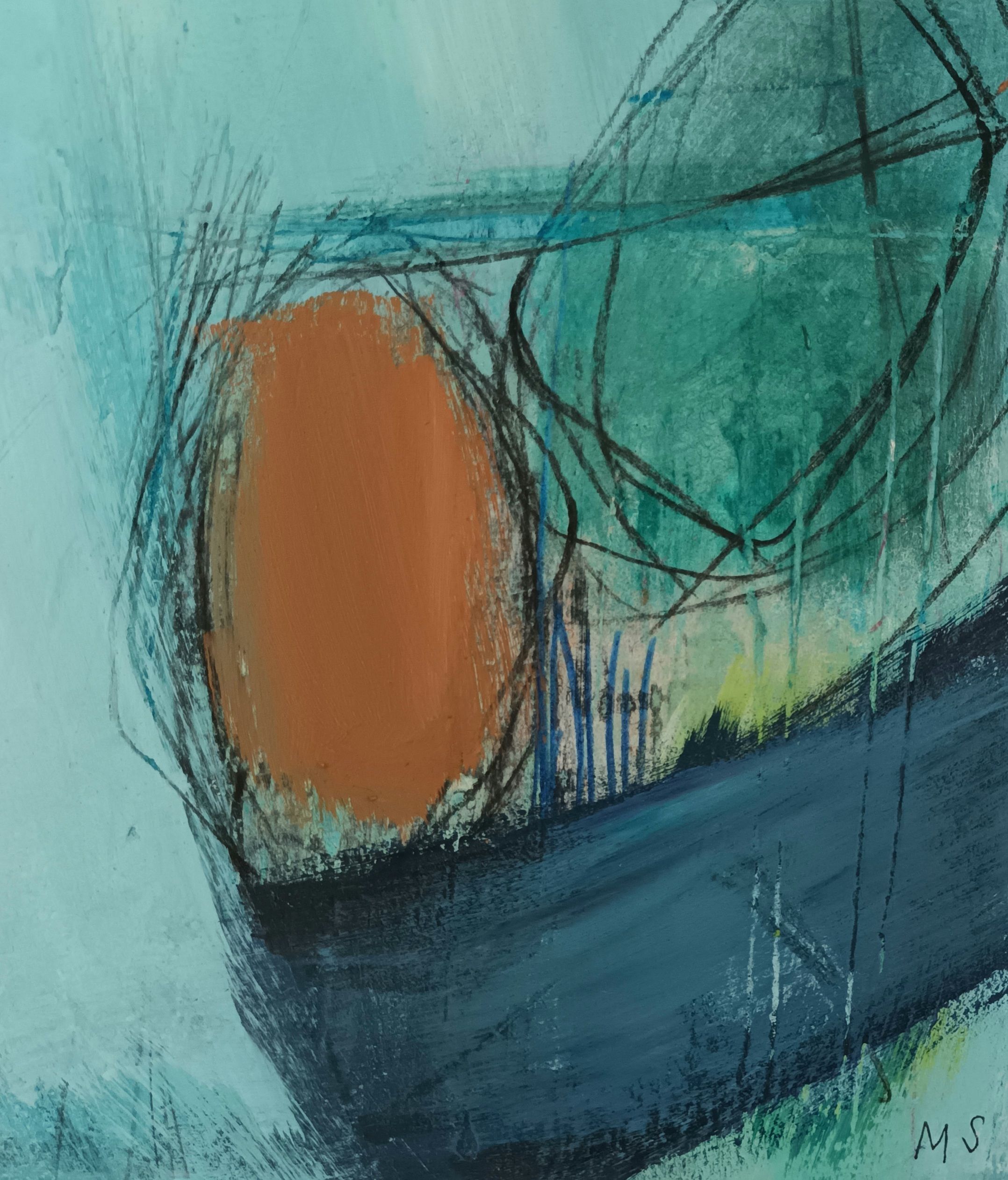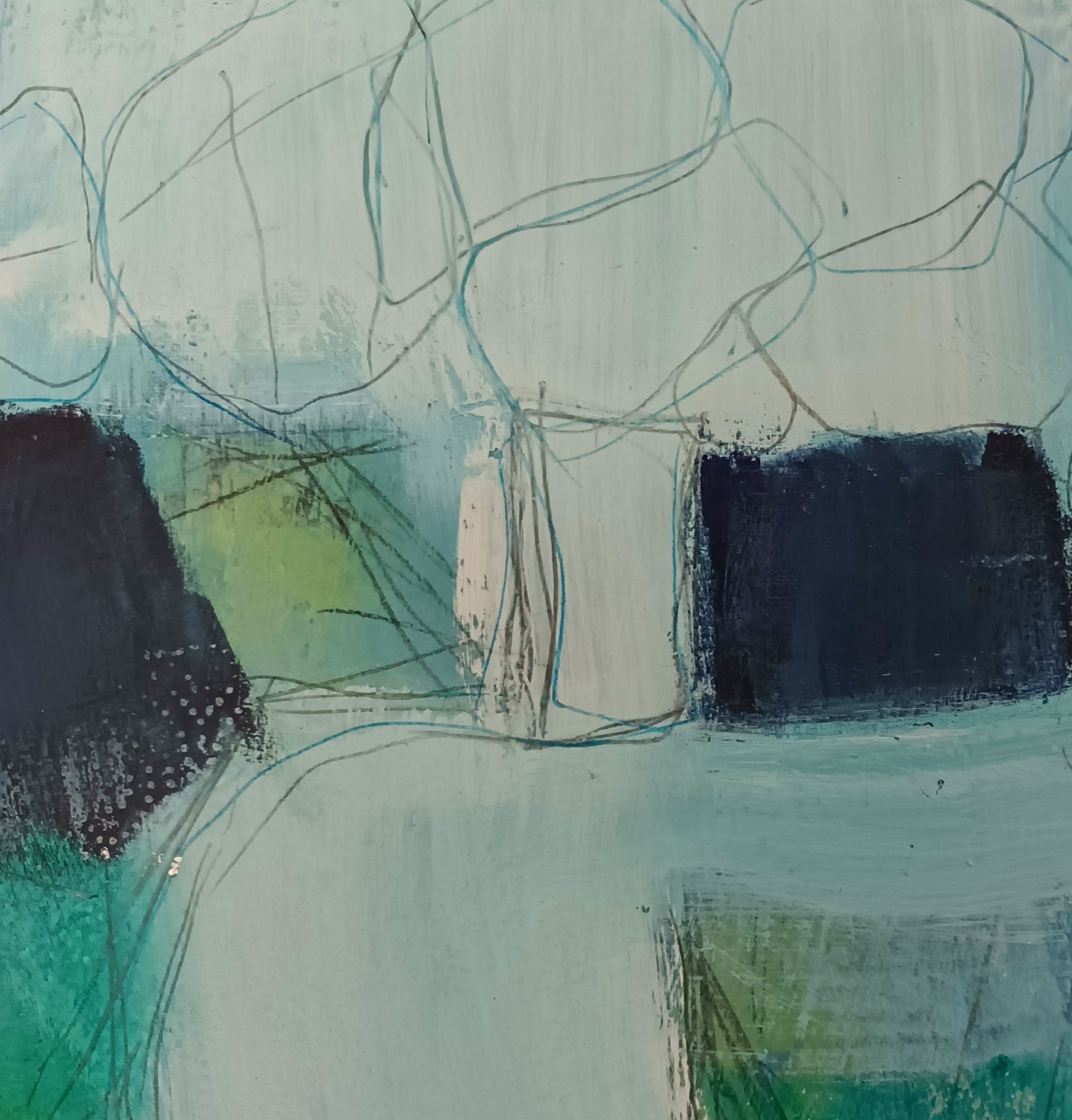 Zennor Calling (IV) is an original work by Mary Scott. This is the final painting in a series of four abstract landscapes inspired by the cliff path between the busy harbour town of St Ives and the remote village of Zennor some six miles to the south west. One of